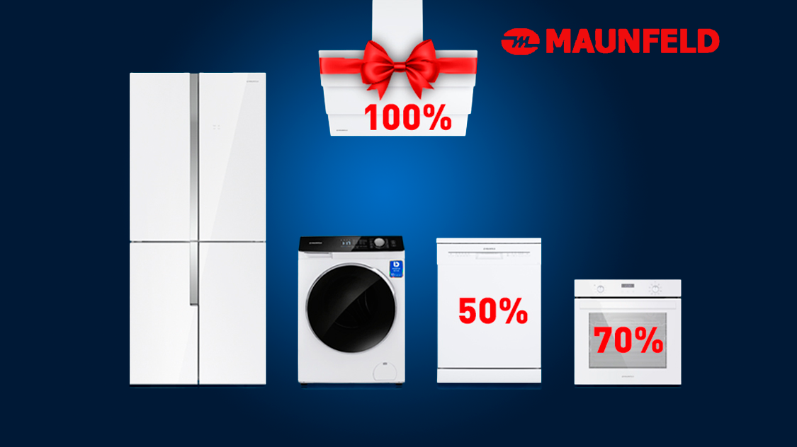 1. При покупке комплекта из 2-х приборов крупной бытовой техники ТМ Maunfeld вы получаете скидку 50% на третий прибор с наиболее низкой стоимостью в комплекте.